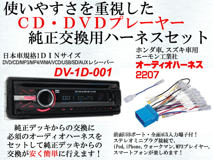 Dvdプレーヤー 1din ホンダ用 スズキ用 車載用cdデッキdvdデッキcdプレーヤーdvd プレイヤーcprmスマートフォン対応ipod対応usbauxsdドレスアップ内装パーツカー用品車載カーオーディオ27ハーネス付 カーオーディオ